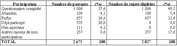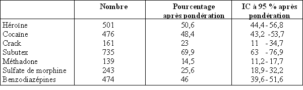 Les répondants et les non répondants ne différent ni pour l’âge ni pour le sexe. La moyenne d’âge est de 30 ans (18% ont moins de 25 ans), 74% sont des hommes, 37% sont "sans toit stable" (hôtel, squatt, sans domicile fixe) et 75% déclarent au moins un recours aux soins spécialisés dans les 6 derniers mois. Soixante deux pour-cent ont été incarcérés au moins une fois dans leur vie (n=622) dont 19% (n=117) disent avoir eu recours à l'injection durant leur détention. Parmi les sujets déclarant avoir été testés (entre 84 et 92% selon les virus), 19 % se disent infectés par le VIH, 21 % par le VHB et 58% par le VHC. L ’ancienneté moyenne de la consommation de drogue était de 11 ans, celle de l ’injection de 10 ans. Les injecteurs de moins de 2 ans représentaient 8 % de la population de l’enquête. Les résultats (tableau 1) ont mis en évidence une forte utilisation des médicaments et une polytoxicomanie importante associant produits illicites (héroïne, cocaïne, crack), médicaments de substitution (Subutex®, méthadone), psychotropes (benzodiazépines). Vingt neuf pour-cent des usagers de drogues participant à l’enquête n'ont injecté que des médicaments pendant cette période.