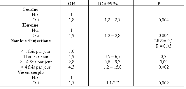 Après l’analyse de régression logistique (tableau 2), le partage de seringue est d'autant plus fréquent chez les consommateurs de cocaïne et/ou d'héroïne que le nombre d'injections journalières est grand. Il est également plus fréquent chez les UDIV qui vivent en couple.
