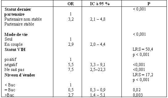 La non utilisation du préservatif lors du dernier rapport sexuel (sans tenir compte des statuts sérologiques des partenaire) était associée au fait de vivre en couple ou d’avoir un partenaire stable, d’être séronégatif pour le VIH ou de ne pas connaître son statut, d’avoir un niveau d’études supérieur au bac (tableau 3). Les variables caractérisant l'histoire de la toxicomanie, les produits ou la situation sociale, à l'exception du niveau d'étude, ne sont pas associés aux comportements sexuels à risque.